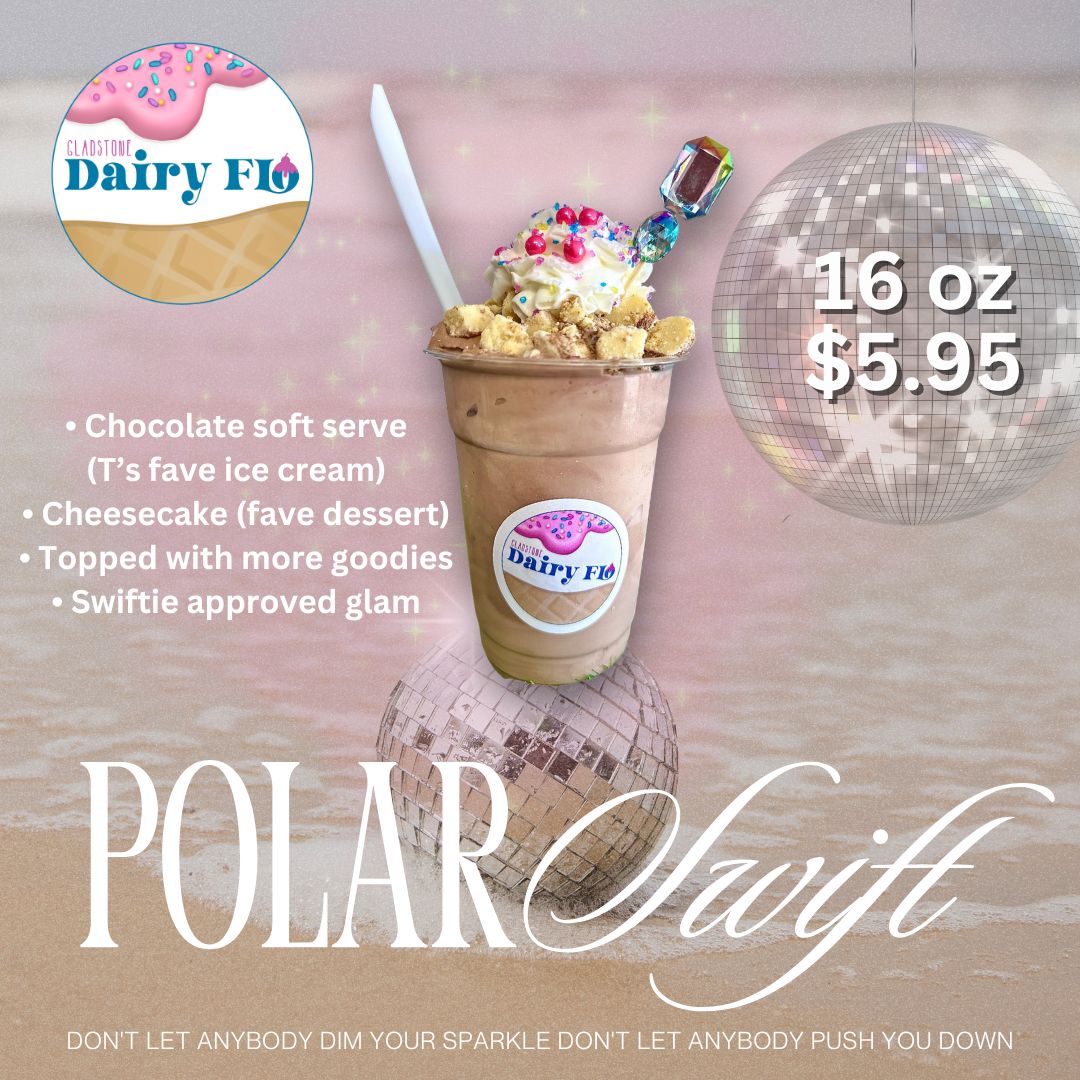 A polar freeze made with chocolate ice cream (Taylor’s fave flavor) and mixed with cheesecake (her fave dessert)! ????Topped with extra fancy stuff that she would totally approve of!