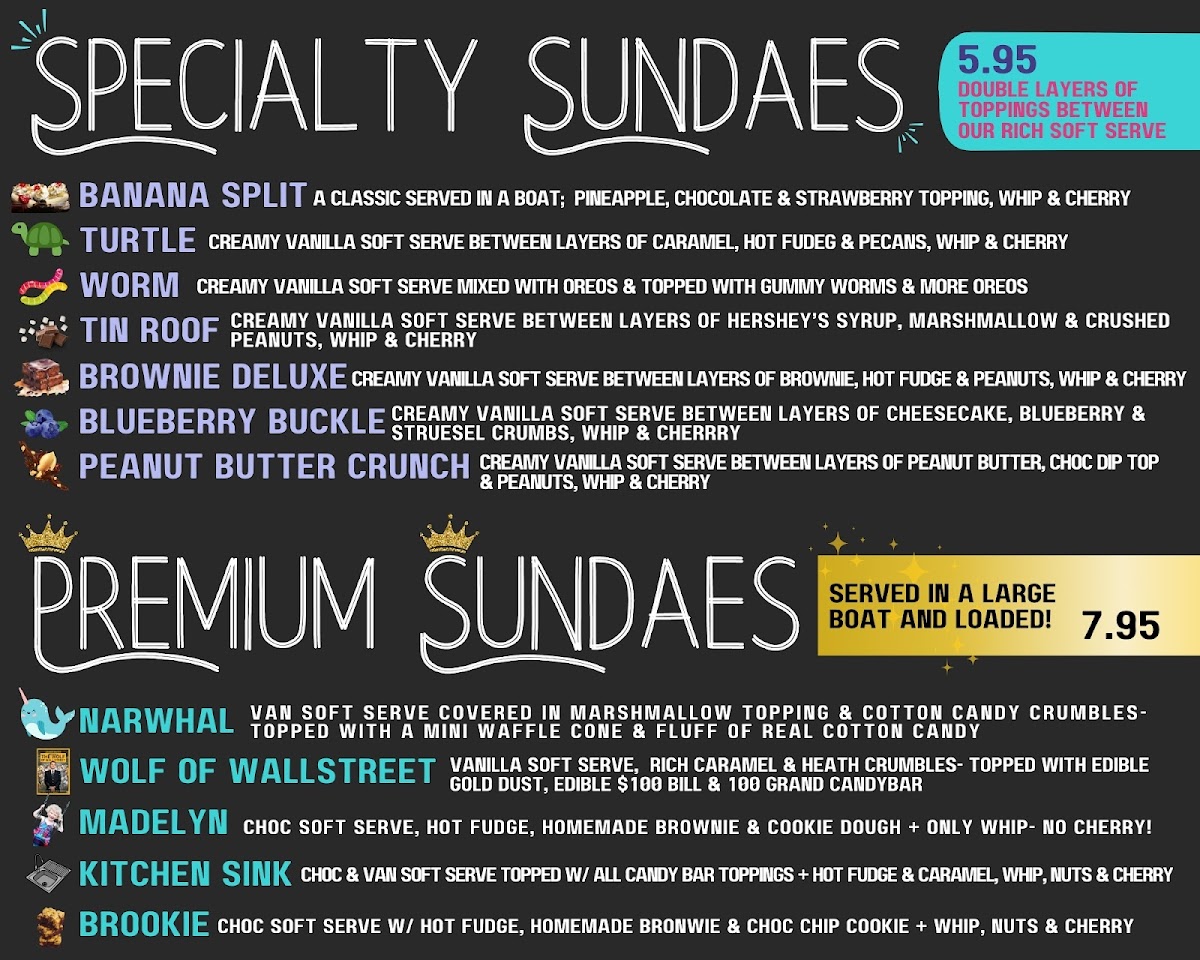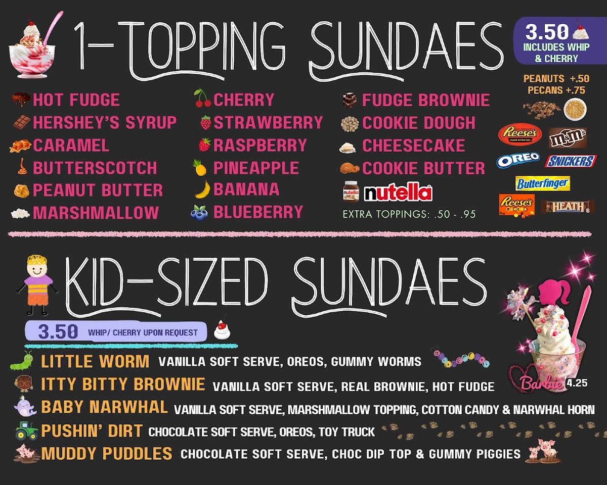 vanilla soft serve in a boat, marshmallow topping, cotton candy crumbles, real cotton candy, a sugar cone "horn" and cute decor