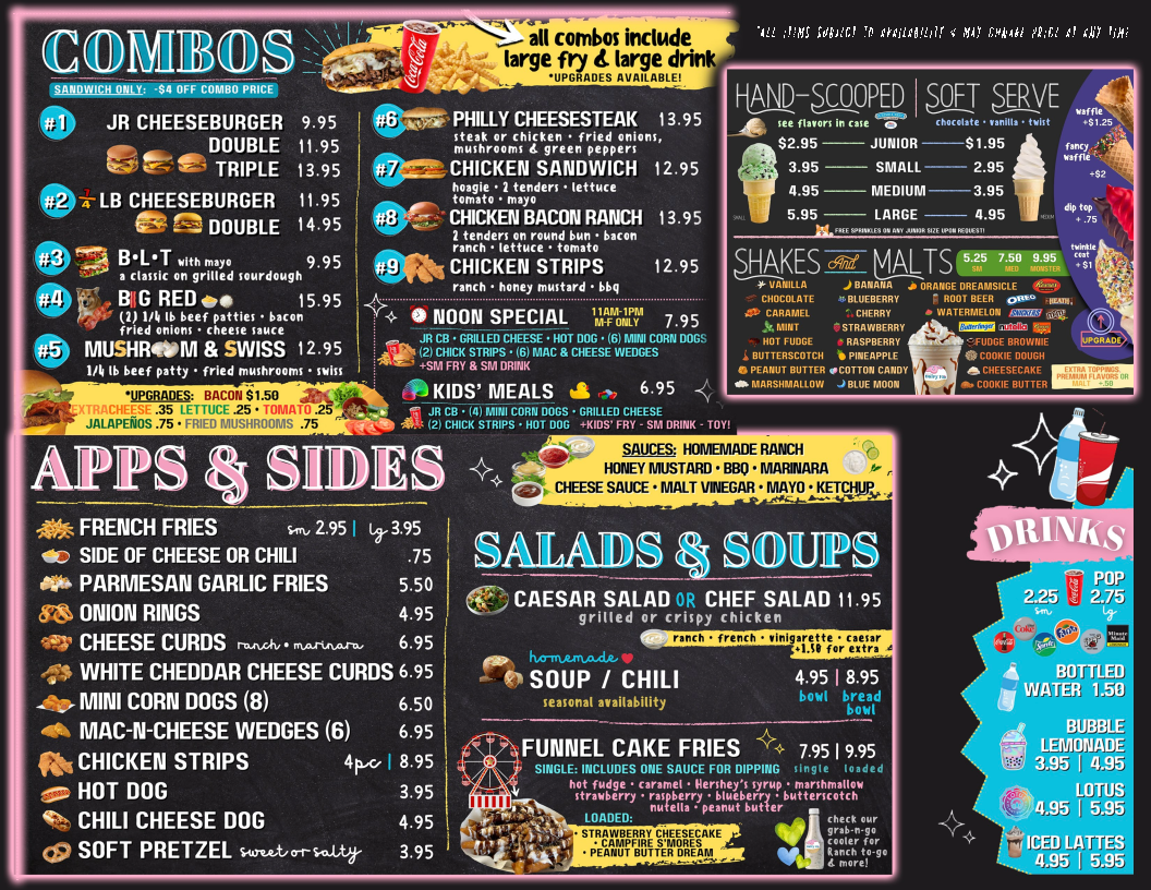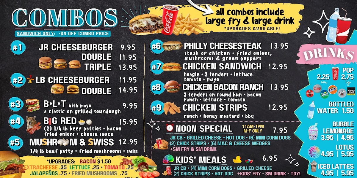 Burger lovers will appreciate the a la carte Burgers & Sandwiches such as the juicy Triple Jr Cheeseburger, the creamy Mushroom & Swiss, and crunchy Chicken Strips. Combo meals are plentiful and thoughtfully assembled-highlights include the #5 Mushroom & Swiss Combo, #4 Big Red Combo, and #9 Chicken Strip (4) Combo, offering great value and variety.