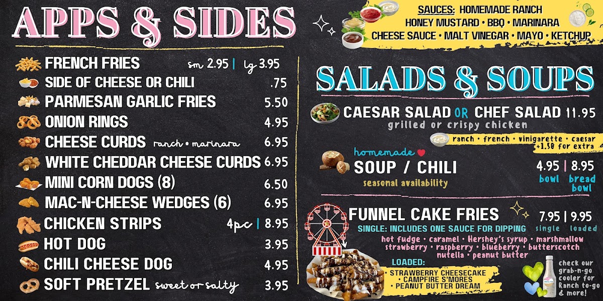 For the little ones, the Kids’ Meals are both satisfying and varied-options like Jr Cheeseburger Kids' Meal, Mac & Cheese Wedges (5) Kids' Meal, and Grilled Cheese Kids Meal ensure every child finds a favorite. On the lighter side, Soups & Salads like the Soup Of The Day, Caesar Salad, and hearty Chili add warmth and balance to the lineup.