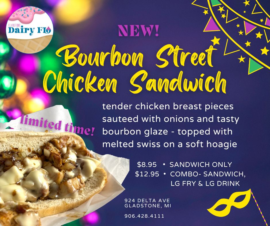 Chicken breast, fried chopped onion in a caramelized Bourbon sauce with melted Swiss on top of our soft hoagie roll. Includes large fry & drink.